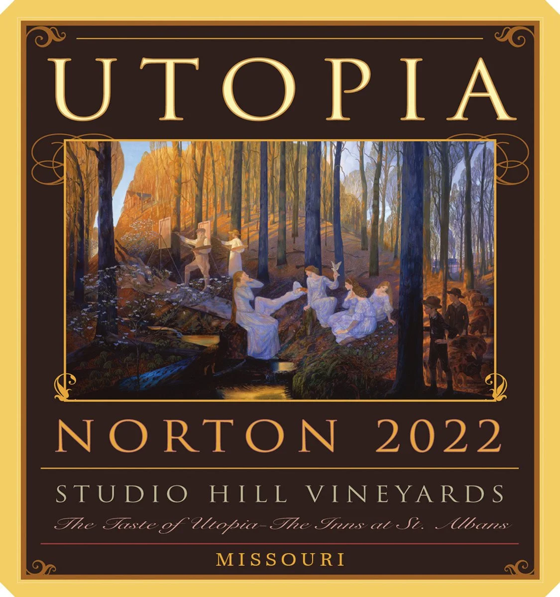 Utopia Norton is an homage to Irene Walter Johnson, the original Grande Dame of St. Albans. In 2013, The Inn at St. Albans founder and owner Datra Herzog established Studio Hill Vineyard at the crown of The Studio Inn overlooking the Missouri River. Under the watchful eye and dedicated hands of vigneron David Herzog, Studio Hill Vineyard yields a boutique crop of Norton grapes. Winemaker Jerry Mueller of Röbller Vineyard in New Haven, Missouri, curates the harvest into Utopia. The 25-year-old vines delivered incredible texture in 2015. Our extended cellar process created a robust outcome tamed with 36 months of barrel aging prior to bottling.